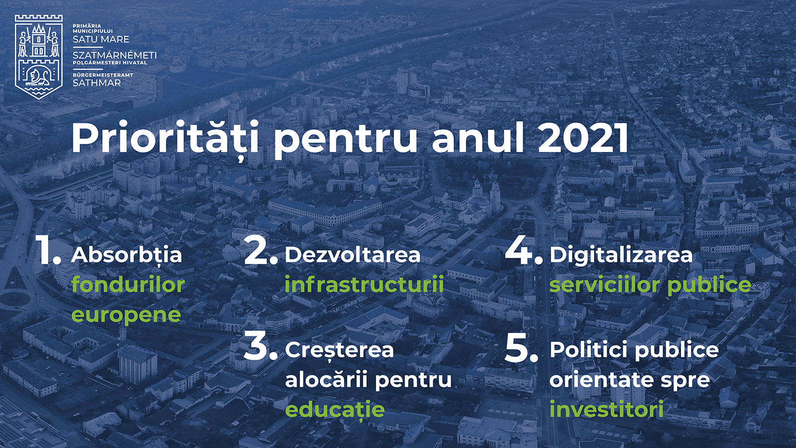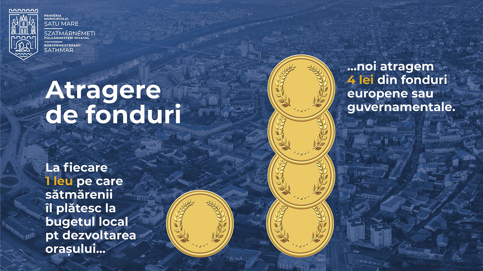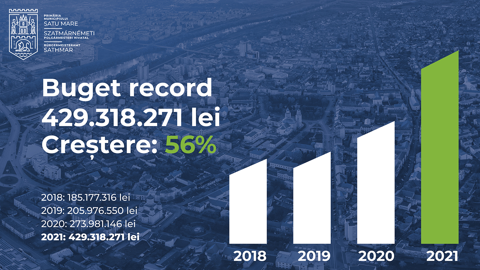 ,,Primăria Municipiului Satu Mare propune ca mai bine de 210 milioane de lei din bugetul pe 2021 să fie alocați pentru dezvoltare. Prioritate în privința alocării fondurilor, sunt proiectele cu finanțare din fondurile europene și proiectele de investiții aflate în perioada de desfășurare. Ne propunem ca anul acesta să absorbim fonduri europene de 164 milioane lei. La fiecare leu pe care sătmărenii îl plătesc la bugetul local pentru dezvoltarea orașului, noi atragem 4 lei din fonduri europene sau guvernamentale”, a declarat primarul Kereskényi Gábor.