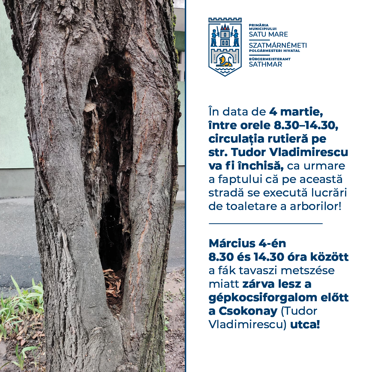 Primăria Municipiului Satu Mare anunță că în data de 4 martie, între orele 8.30-14.30, circulația rutieră pe str. Tudor Vladimirescu va fi ÎNCHISĂ, ca urmare a faptului că pe această stradă se execută lucrări de toaletare a arborilor. Acțiunea se desfășoară cu avizul Biroului Rutier Satu Mare. Vă mulțumim pentru înțelegere!