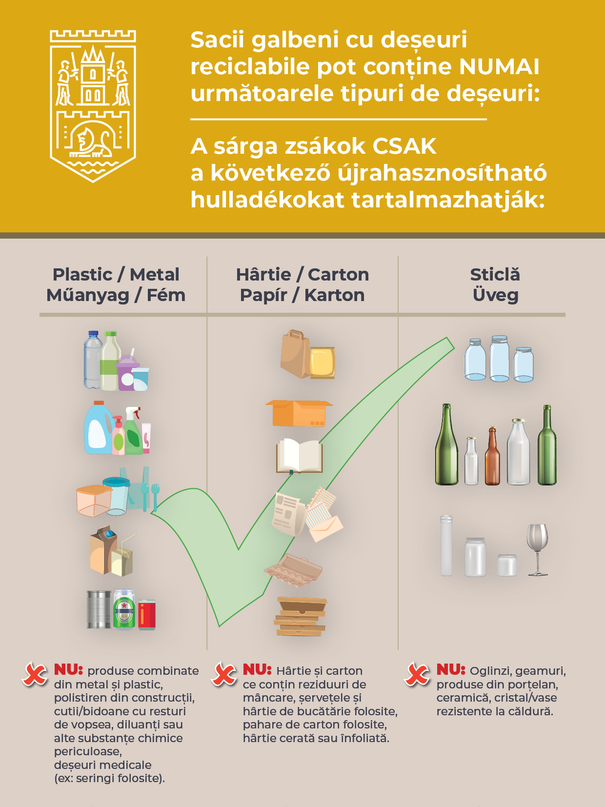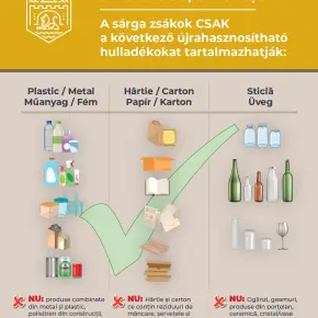 Din grijă pentru mediu și pentru sănătatea celor din jur, ne mobilizăm să colectăm selectiv deșeurile reciclabile!  Pentru o mai bună gestionare a deșeurilor care provin de la gospodăriile individuale, vă atenționăm că în sacii galbeni trebuie puse DOAR deșeuri care respectă regulile de colectare selectivă. Astfel, vă rugăm să consultați lista cu deșeurile reciclabile acceptate: