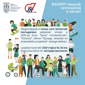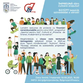 Primăria Municipiului Satu Mare, prin Centrul Cultural G.M. Zamfirescu lansează, în baza legii Nr. 350/2005, sesiunea de proiecte cu finanțări nerambursabile, anul 2021, pe trei linii de finanțare: programul ,,Sportul pentru toți”, Cultură și „Proiecte de tineret, învățământ şi recreative”. Finanțarea este defalcată astfel: