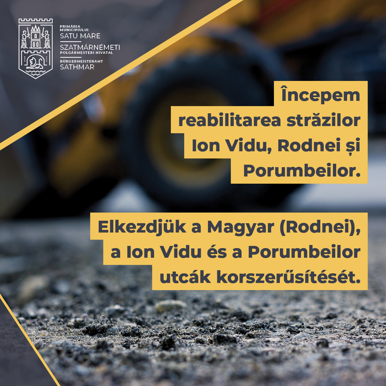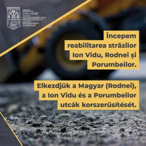 A Szatmárnémeti Polgármesteri Hivatal tájékoztatja az érintetteket, hogy március 5-én szerdán elkezdődik a Magyar (Rodnei), a Ion Vidu és a Porumbeilor utcák korszerűsítése, amely során többek között az úttest és a járda is új borítást kap. Felhívjuk a figyelmüket, hogy az említett utcákban forgalomkorlátozások várhatóak. Megértésüket köszönjük!