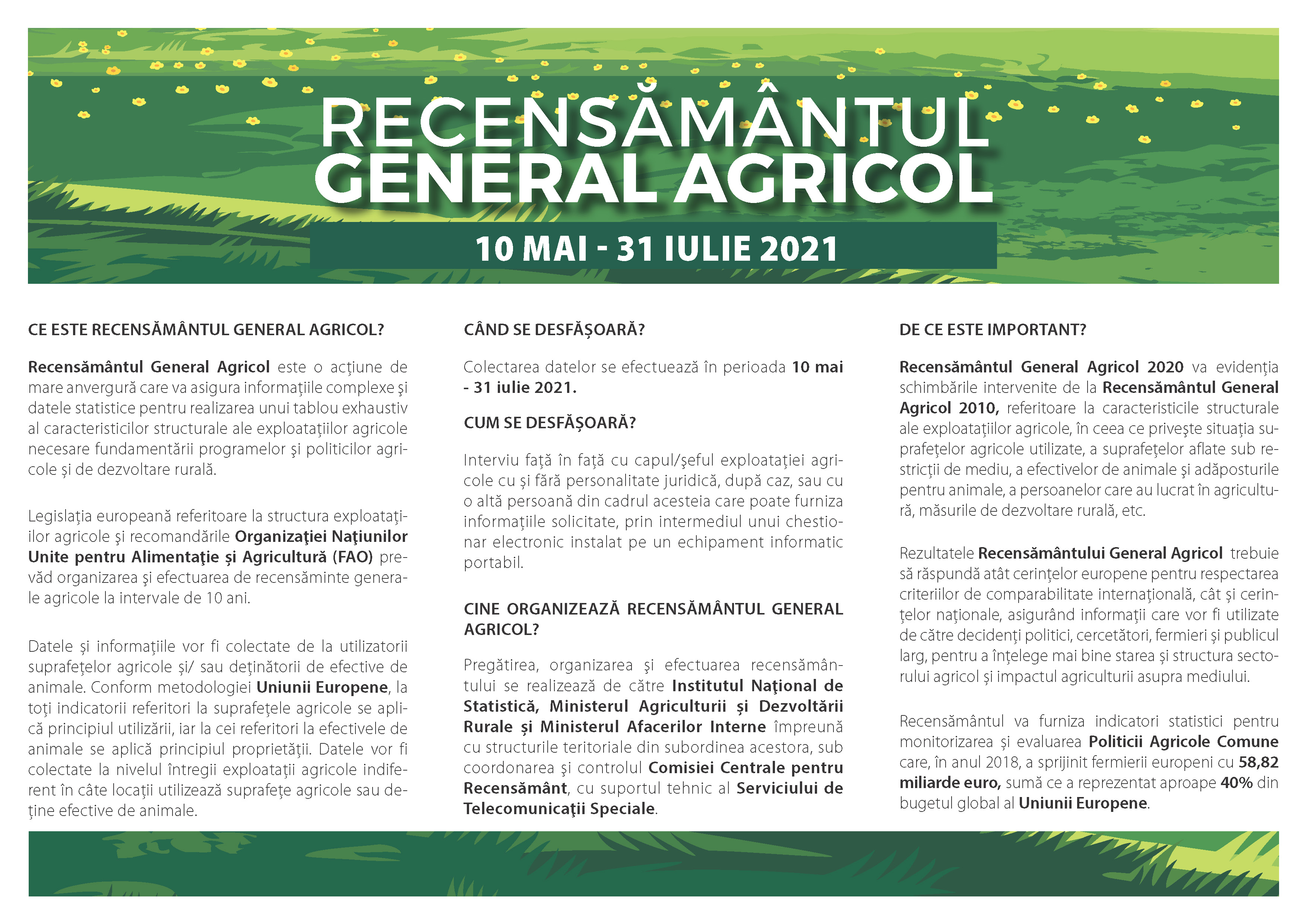 Tisztelt szatmáriak! Tájékoztatjuk Önöket, hogy május 10. és július 31. között Szatmárnémetiben is sor kerül a mezőgazdasági összeírásra, amely során a számláló biztosok minden  területet és háziállatot nyilvántartásba vesznek. Az összeírás a következő időszak agrárstratégiájának és mezőgazdasági programjainak minél hatékonyabb kialakításához szükséges. A biztosok a Mezőgazdasági Igazgatóság által kibocsájtott kártyával igazolják magukat.