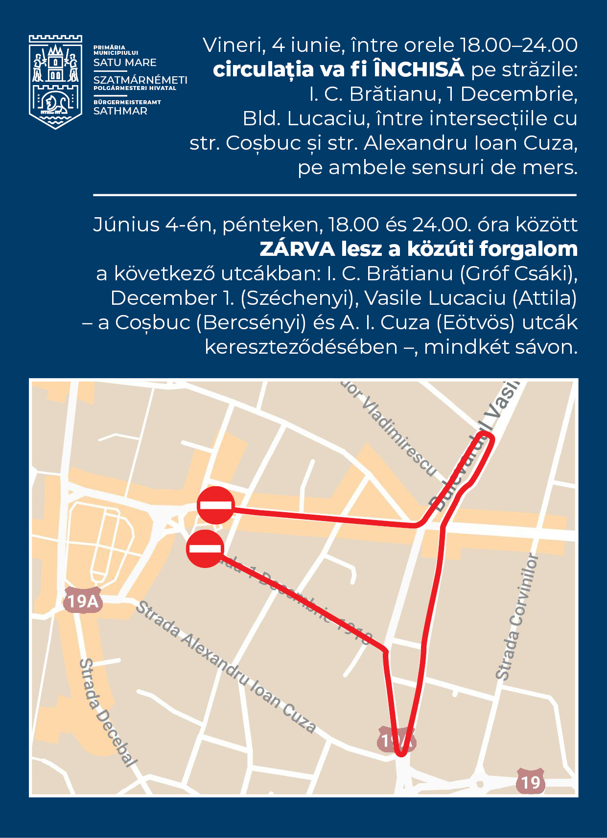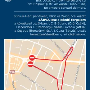 Pénteken, 18 órától 24 óráig ÚTLEZÁRÁSra kerül sor a következő utcákon: I.C. Brătianu, 1 Decembrie, Vasile Lucaciu, a Coșbuc és Alexandru Ioan Cuza utcák kereszteződésében, mindkét sávon.