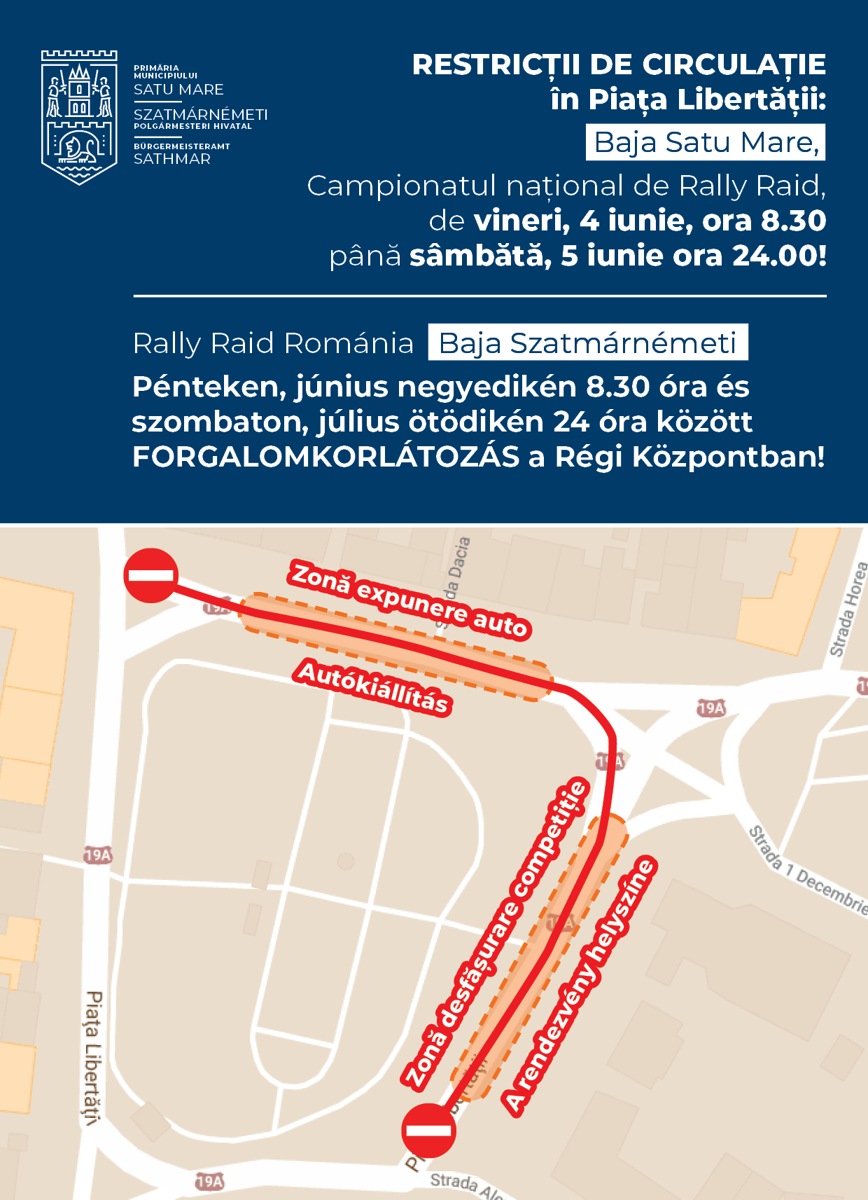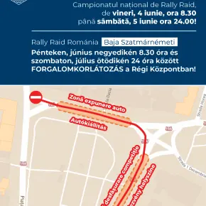 Az Országos Tereprallye Bajnokság szervezői, a Baja Satu Mare eseménnyel kapcsolatban a következő útlezárásokról értesítik a lakosságot: a régi központban június 4-én, pénteken, 8.30-tól június 5., szombat 24 óráig útlezárás várható.