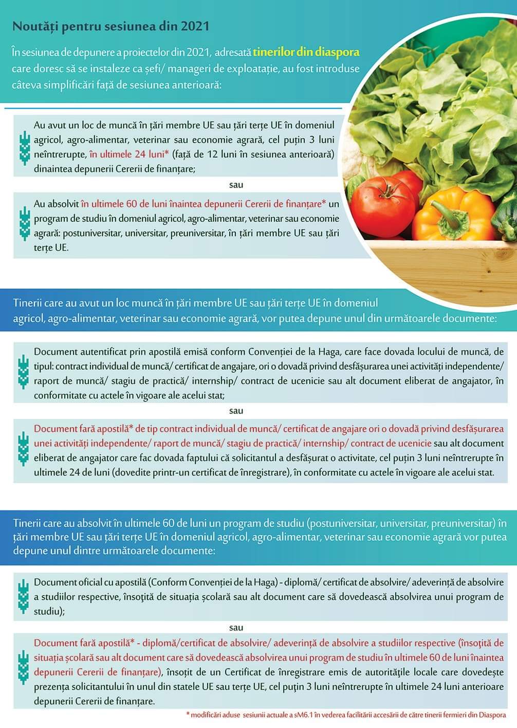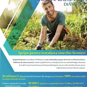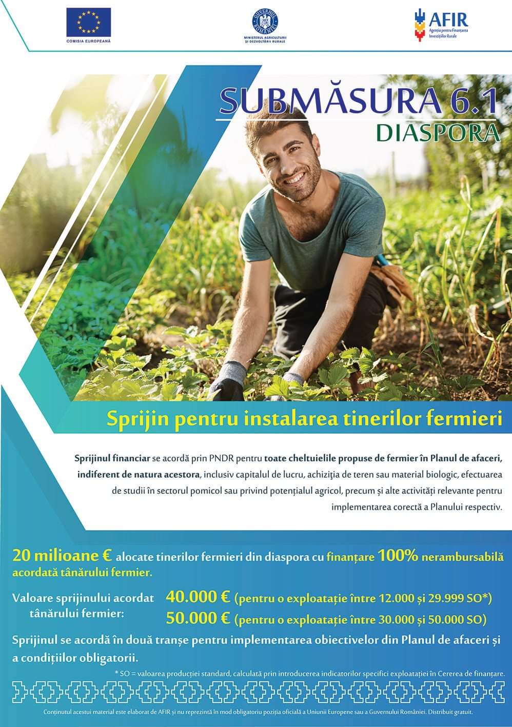 Începând cu data de 04.01.2021, AFIR a lansat submăsura 6.1 Instalarea tinerilor fermier, componenta DIASPORA, instrument financiar care reprezintă o oportunitate pentru tinerii români din străinătate (sub 40 de ani) de a reveni în țară și a începe o activitate agricolă.